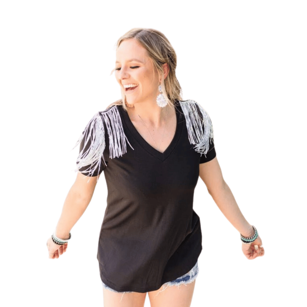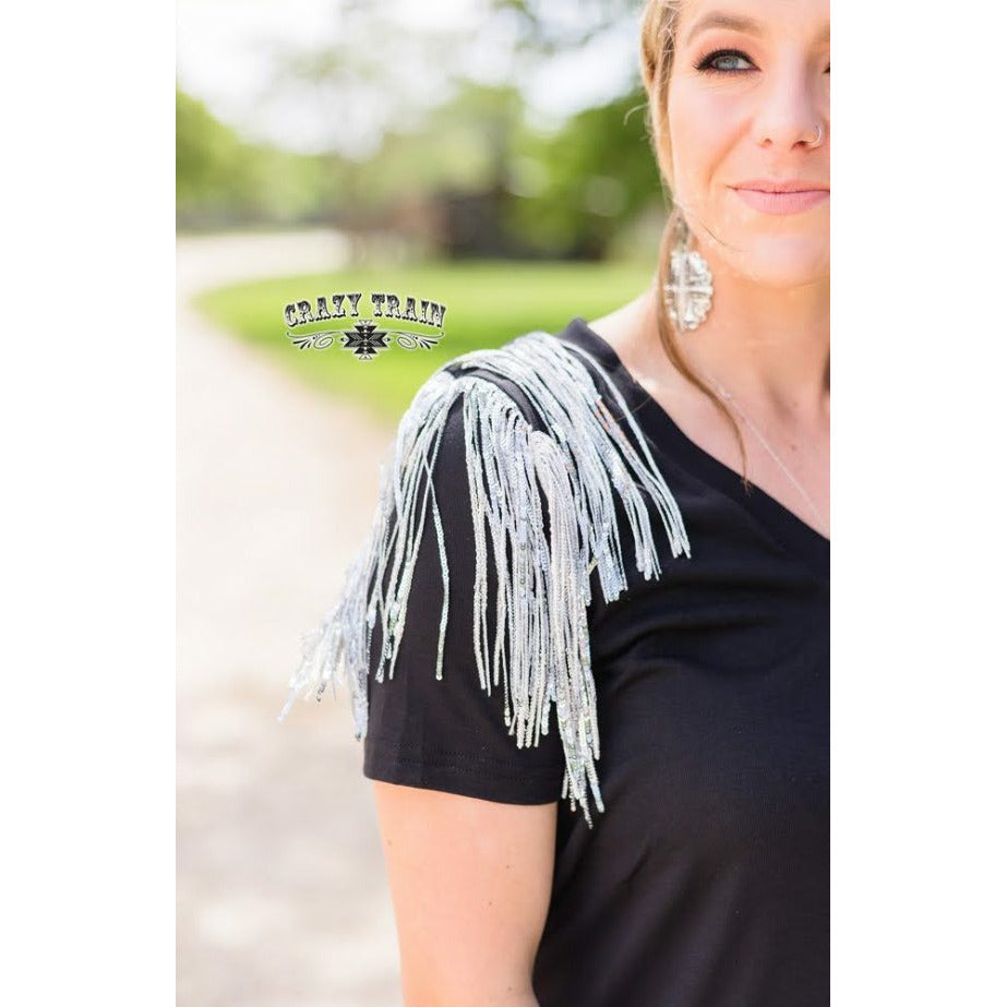 I love the Everything That Glitters Top from Crazy Train! This has the great comfortable top with super-cute glitter flair on the shoulders! I love the deep v-neck on this one too. You will look very pretty in this one